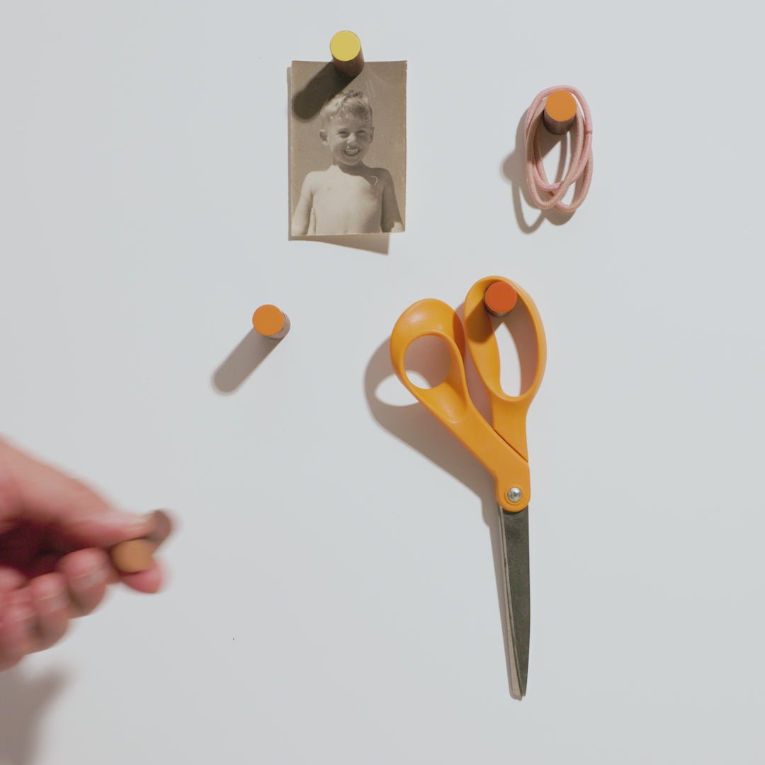 5 Magnetic Hooks. These multi-color hooks come in a convenient bag and are designed to stick to any metal surface. Perfect for hanging keys, holding notes, or displaying photographs, they offer both function and charm. A simple yet stylish addition to your entryway, each hook is crafted from walnut wood and hand-painted in vibrant colors, combining natural warmth with a modern touch.